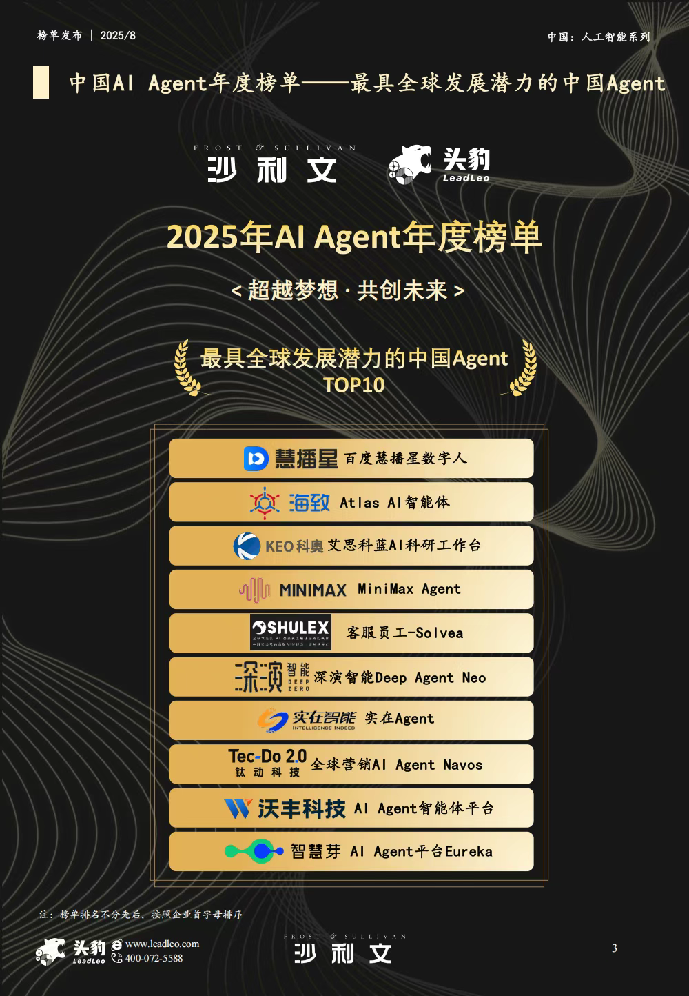 8月28日,全球知名咨询机构沙利文联合头豹研究院发布了《2025年中国AI Agent(智能体)最佳实践应用榜单》,凭借自主研发的 AI 智能体平台 Deep Agent Neo 的突出实力,尊龙凯时智能从 150 家参评企业、近 300 个产品 / 解决方案中脱颖而出,成功入选 “最具全球发展潜力的中国 Agent” TOP10 榜单,再度印证其在 AI Agent 领域的技术硬实力与全球化发展潜力。